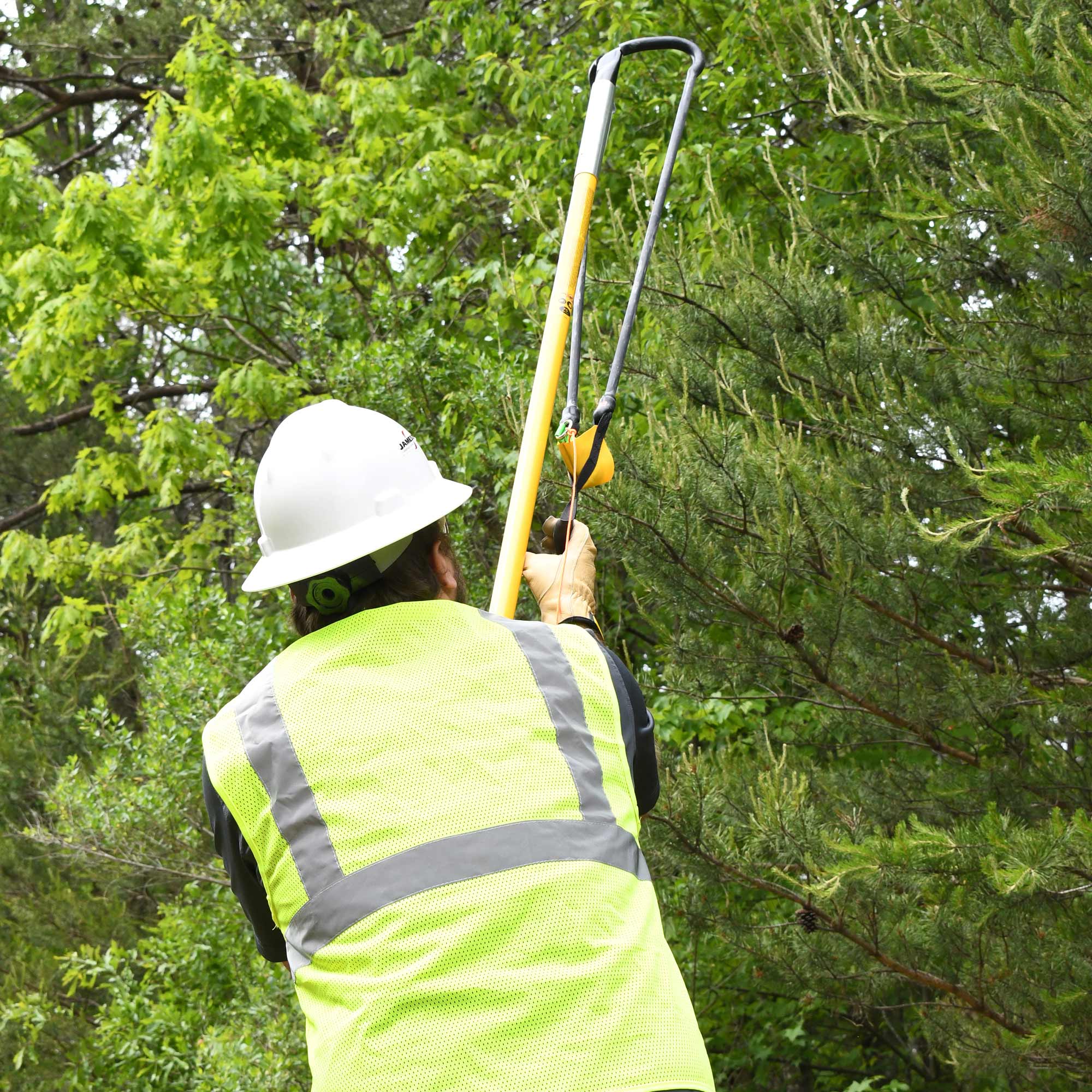 Launches throw bag and line over tree limbs
