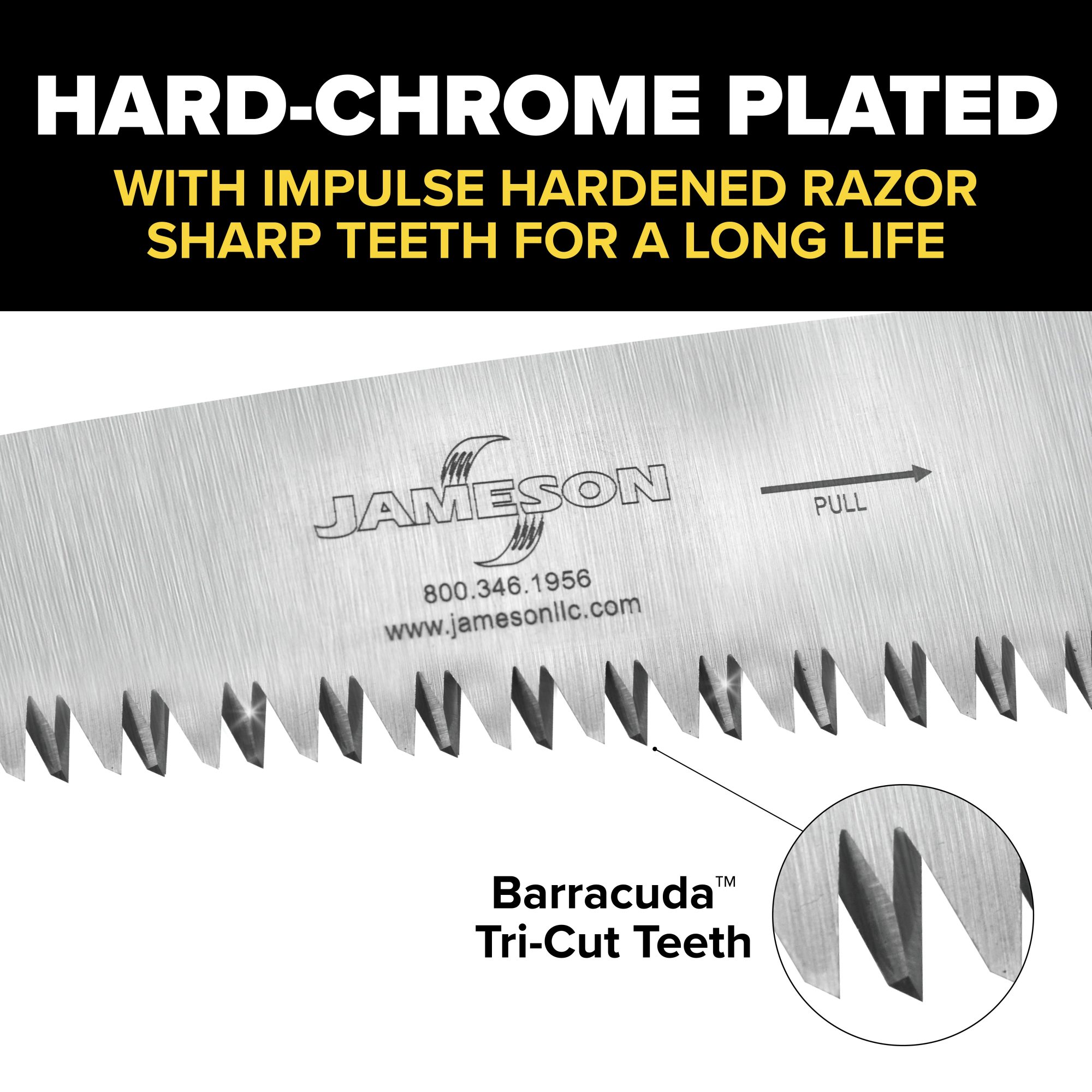 The JE Foam Core Poles, preferred for aerial construction and line clearance, feature a foam core that prevents debris and moisture buildup inside the pole, adding extra hoop strength and rigidity. A polymer protective surface veil prevents fiber blooming from abrasion and UV light. These poles meet OSHA Subpart R 1910.269(j)(1)(i) requirements and are individually tested to 100KV per foot for five minutes. The folding pole saw in this kit combines safety and convenience with its foldable design, lightweight construction, and easy tool installation. Its high-visibility yellow finish prevents tool loss and also serves as a handsaw. Paired with the 13-inch Barracuda™ Tri-Cut Saw Blade, which is hard-chrome plated for cleaner, quicker cuts and extended durability, this dynamic duo enhances efficiency and safety for both arborists and homeowners.
