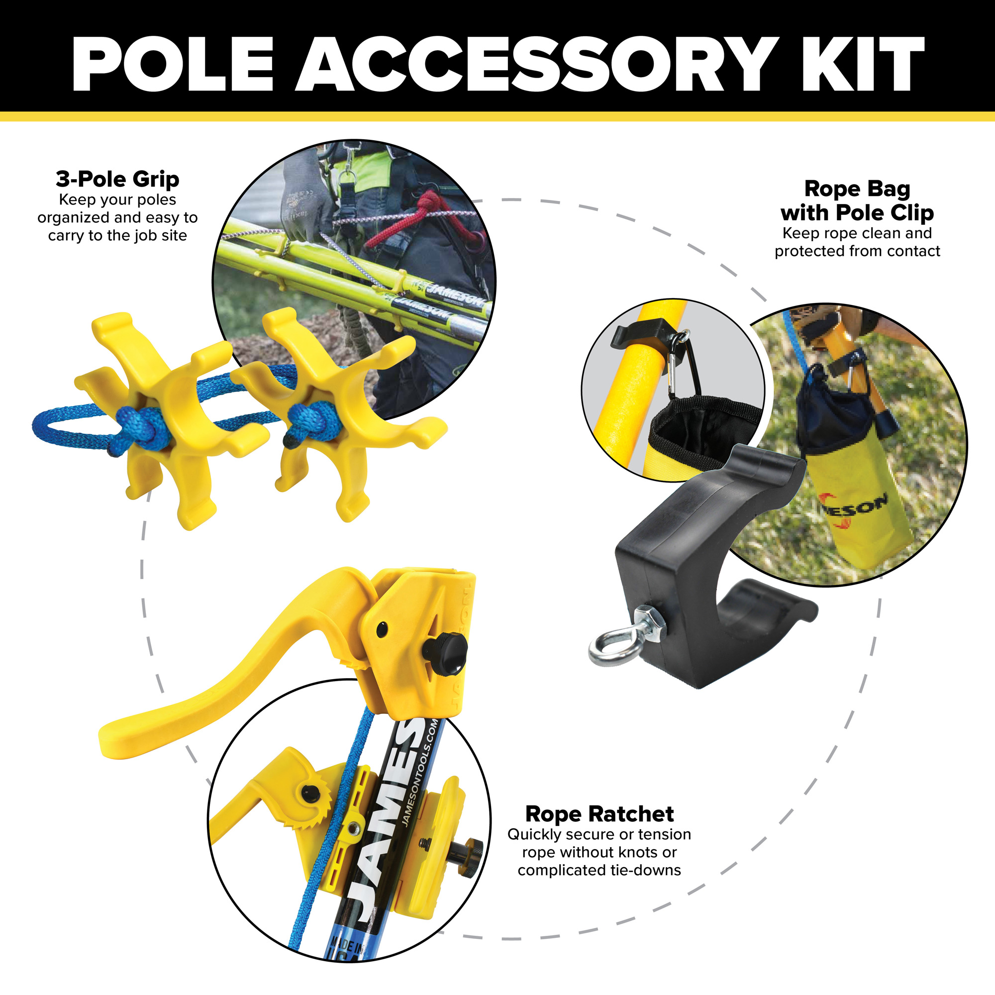 Whether actively pruning, transporting poles to and from the jobsite, or storage for later use, the Jameson Pole Pruner Accessory Kit provides three high-value tools to improve ergonomics and safety, aid in capability, and protect poles and accessories during storage and transit.